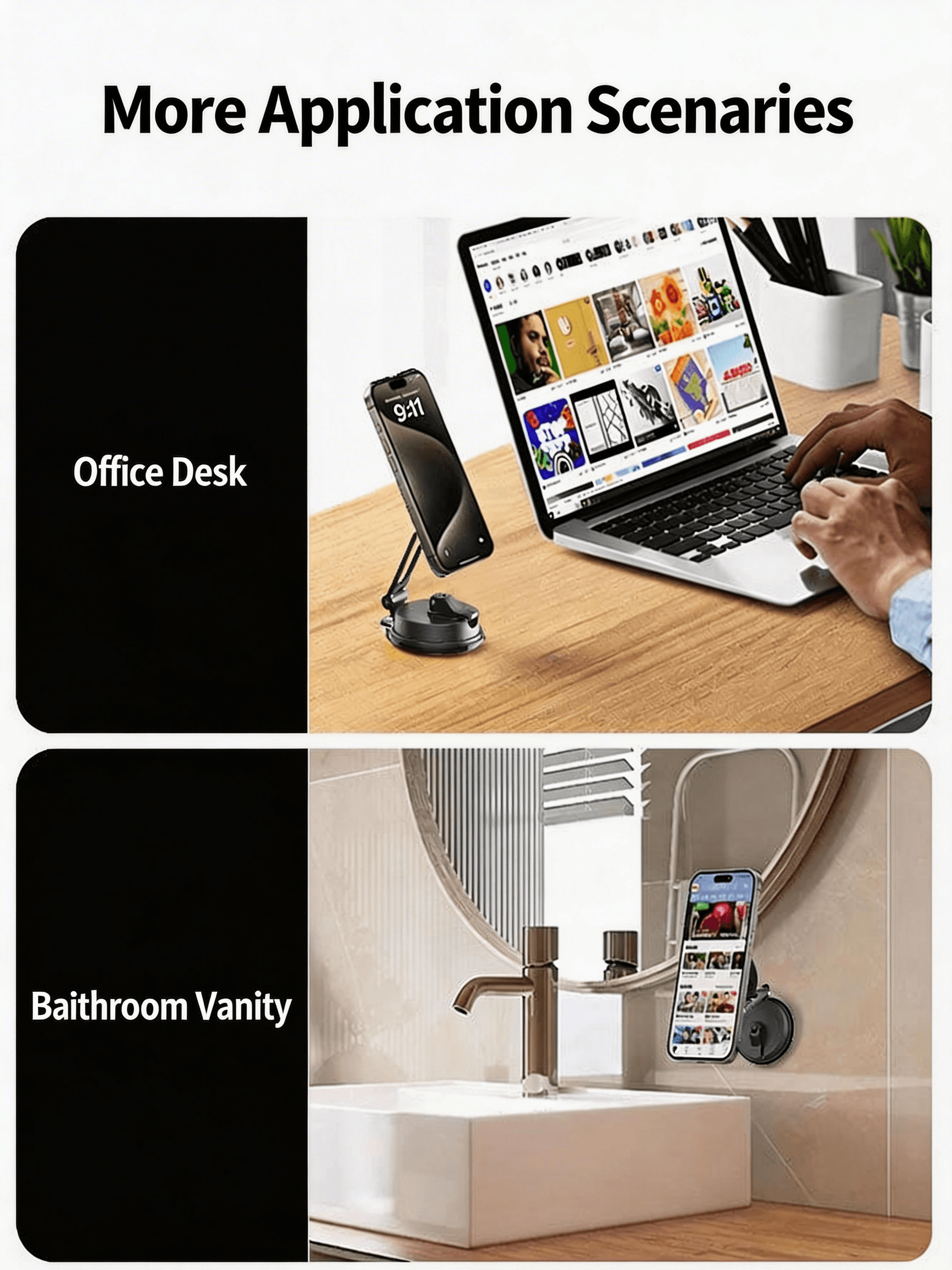 - Powerful Vacuum Suction for Rock – Solid Stability: Featuring an innovative vacuum suction base, a simple press creates a strong hold on smooth surfaces. Whether it’s your office desk, bedside table, or car center console, it stays firmly in place, eliminating wobbles and slips.