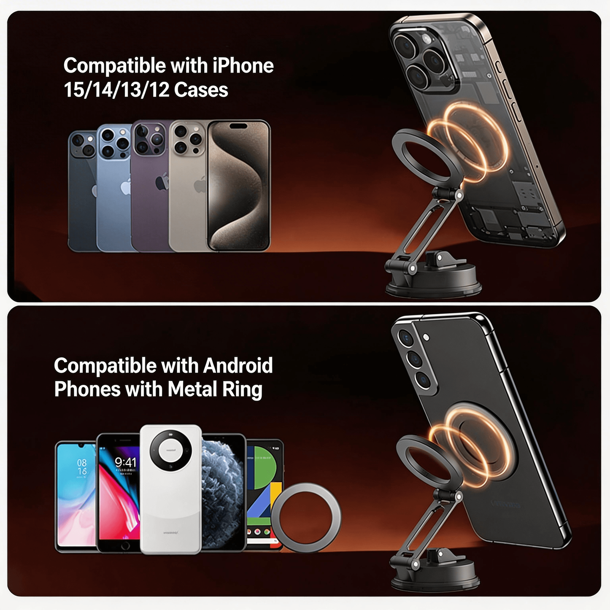 - Universal Compatibility: Works seamlessly with all phone models when paired with the included ultra-thin metal ring or a MagSafe-compatible case. The compact design ensures it won’t block your view or vents.